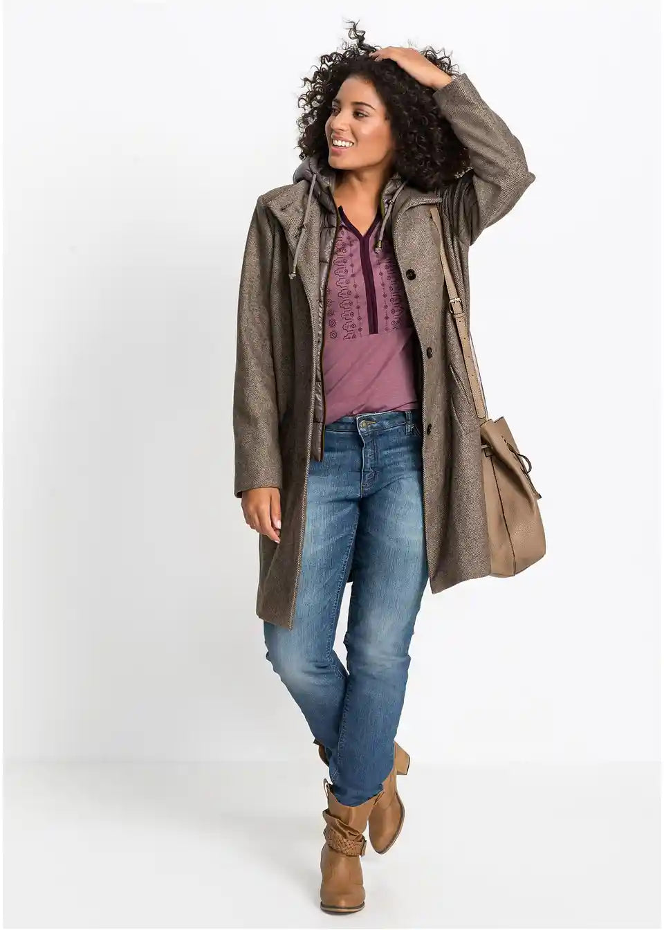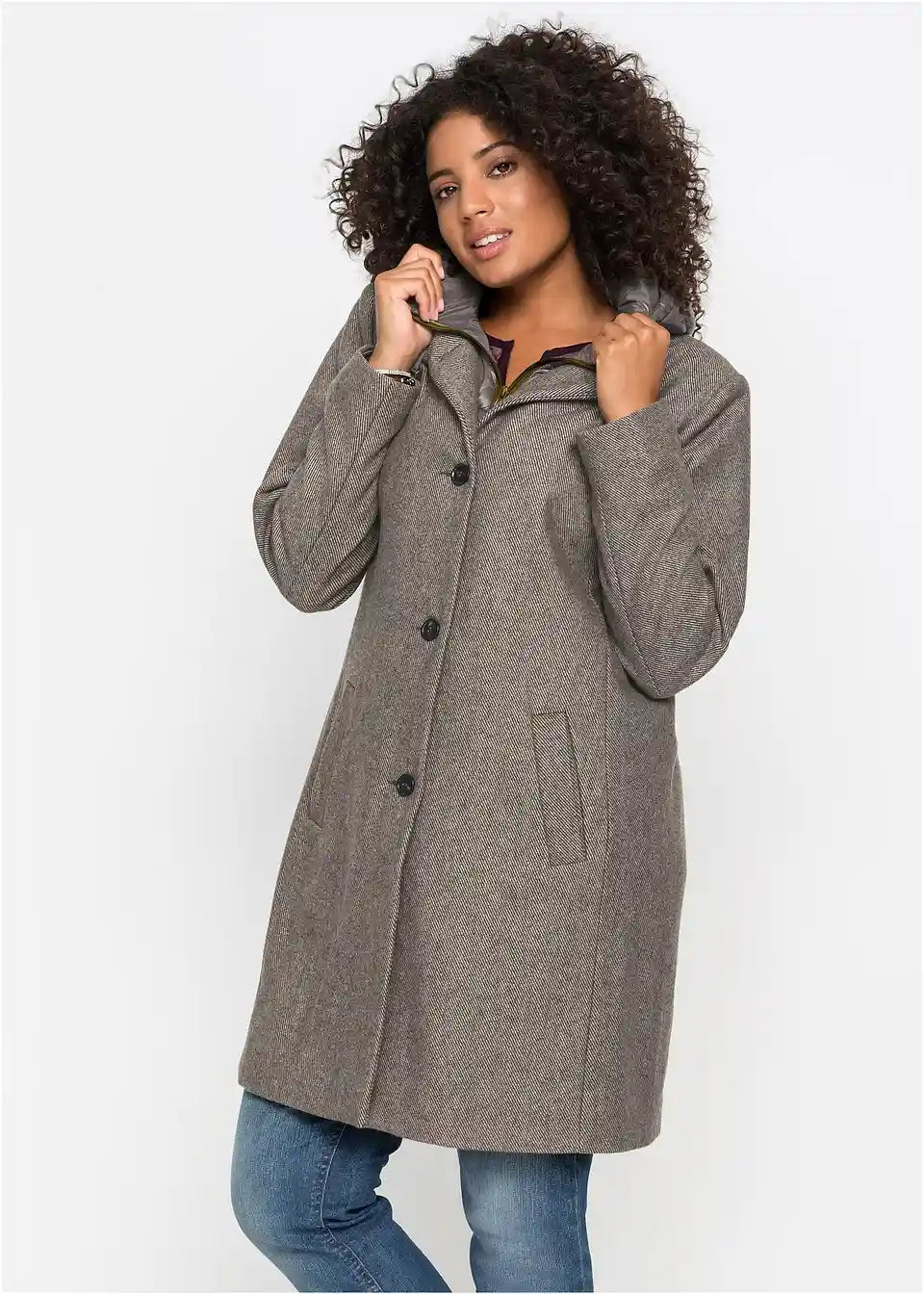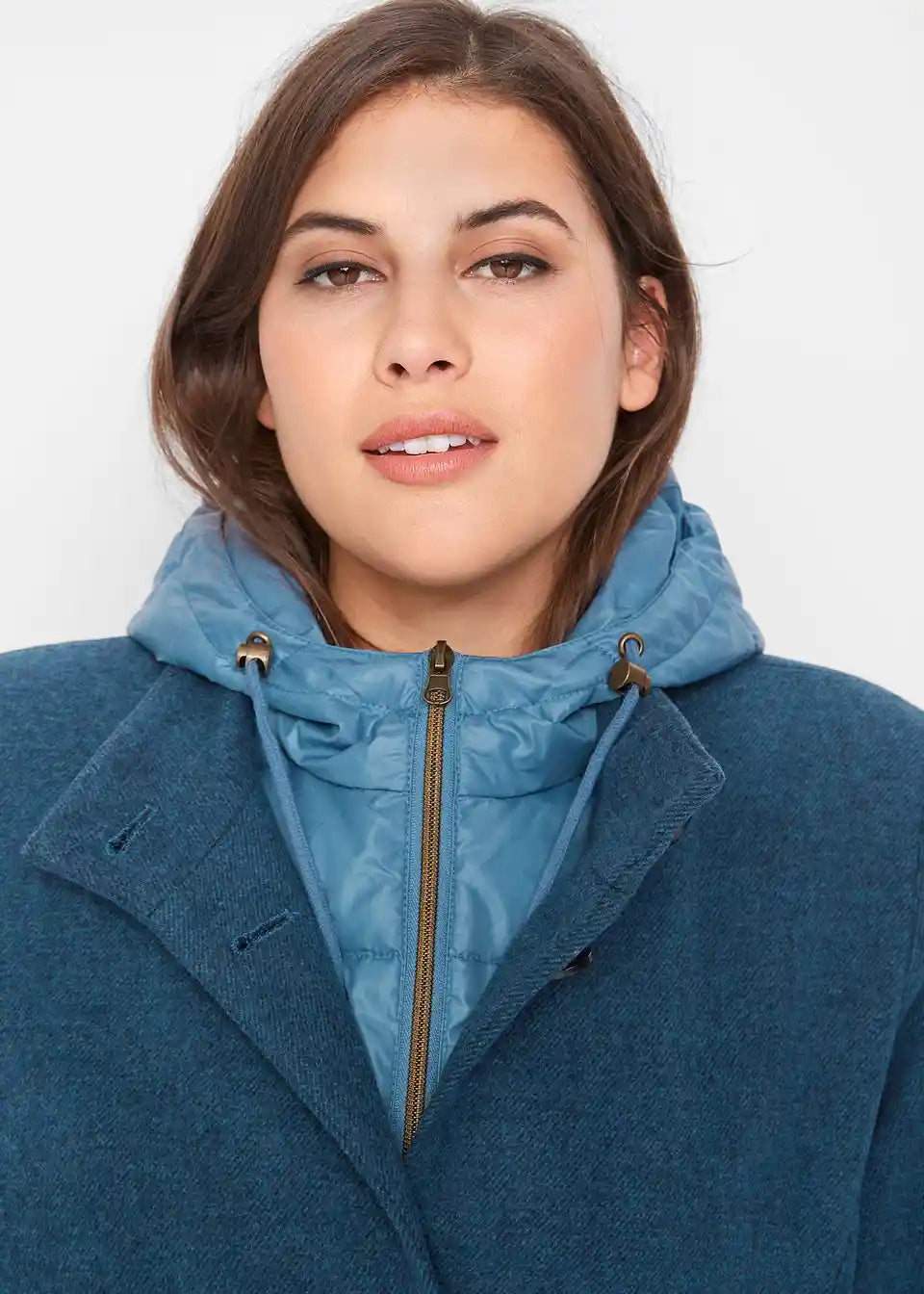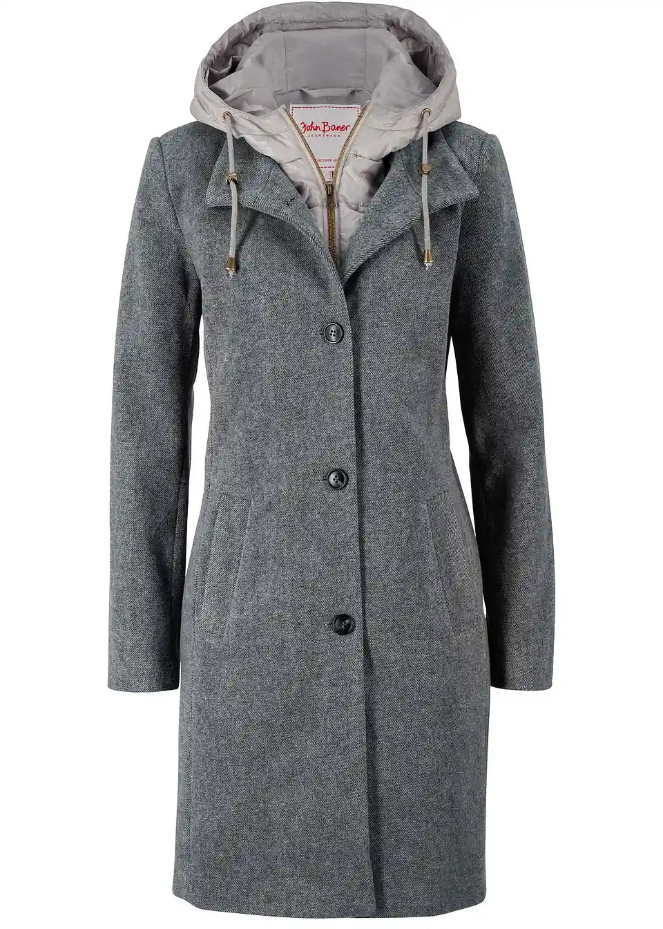 Ovaj moderni zimski kaput u 2-u-1 izgledu kombinira klasičan kroj kaputa s prošivenim umetkom. Gornji kaput impresivan je svojim čistim linijama i zakopčava se dekorativnim gumbima.