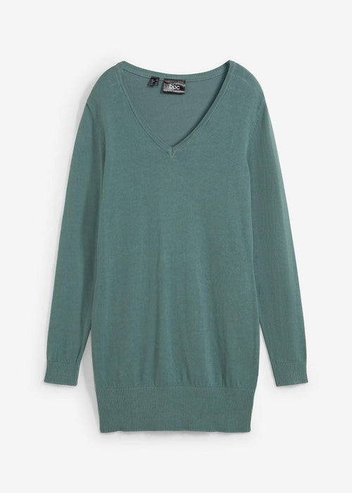 Dugi pulover iz bpc kolekcije, dostupan u svježim bojama, izrađen je od ugodnog finog pletiva. Moderan dugi kroj dobro pristaje uz uske traperice. S klasičnim V-izrezom i tijesnim krojem, pulover naglašava figuru. Ovaj pulover koji se može prati u perilici odjeće je fleksibilan osnovni odjevni predmet za ured i slobodno vrijeme. Prsluci, gilendi ili dugi lančići daju mu dodatnu atraktivnu notu.